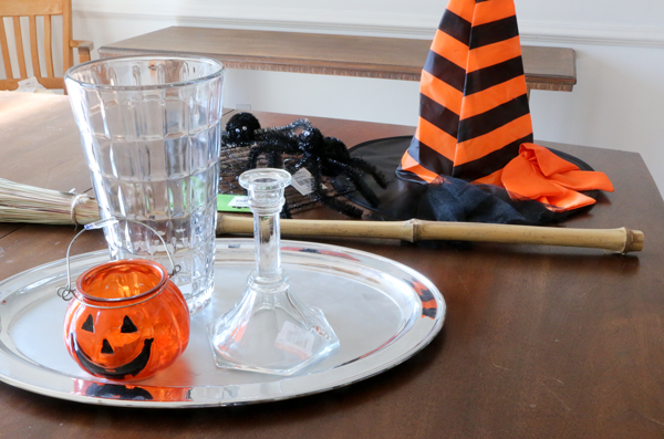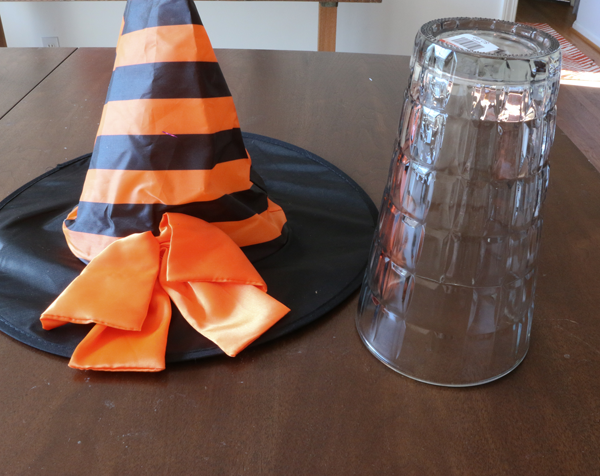 My two ideas were a big Halloween themed cupcake stand and/or drinking glasses that I could paint black and then drip red craft paint down the sides to look like blood.  I loaded up the cart with dishwares, but then happened to see an orange-and-black striped witch hat in the Halloween theme aisle. Instantly, I had my idea.