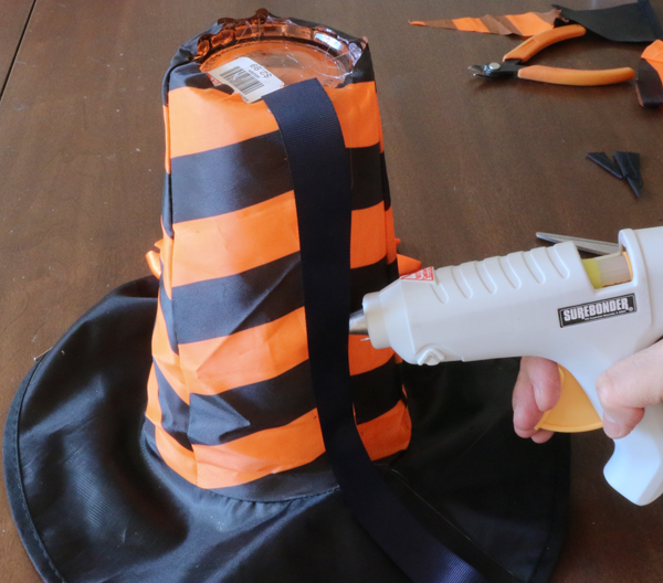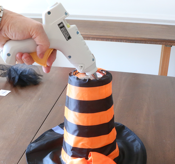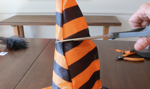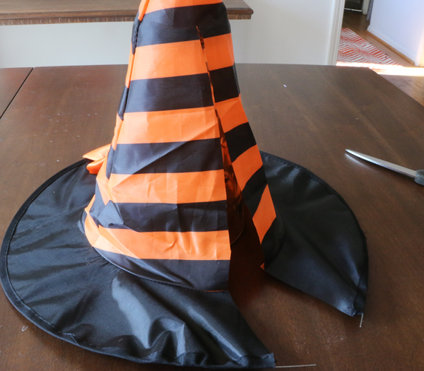 The witch hat went right over the top of the inverted vase to give the stand its base.  I cut the hat brim and all the way up the hat ‘cone’ until I came close to the top.