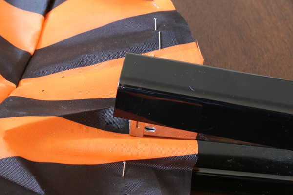 At that point, I just grabbed some straight pins, and pinned the hat to fit snugly around the vase. The next thing was to remove the hat and to staple the hat fabric together along the pin lines.