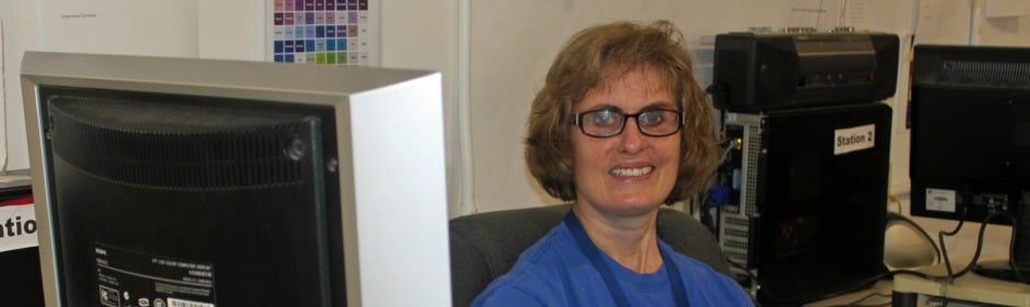 Smiling woman with short light-brown hair and glasses sits at a desk with computer monitors in a lab-like office.