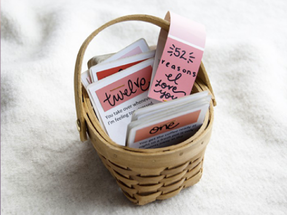 Download the Word template here and customize 52 cards (You’ll need six and a half pages) each with a different reason you love your valentine. Think of the little actions they do, the parts of their personality that you admire, and specific memories only they could have shared with you. Of course, we can’t love anyone else until we love ourselves so if you’re treating yourself this Valentine’s Day, use this opportunity to recognize the qualities you’re proud of. On hard days, coming back to these cards will empower you to move forward.