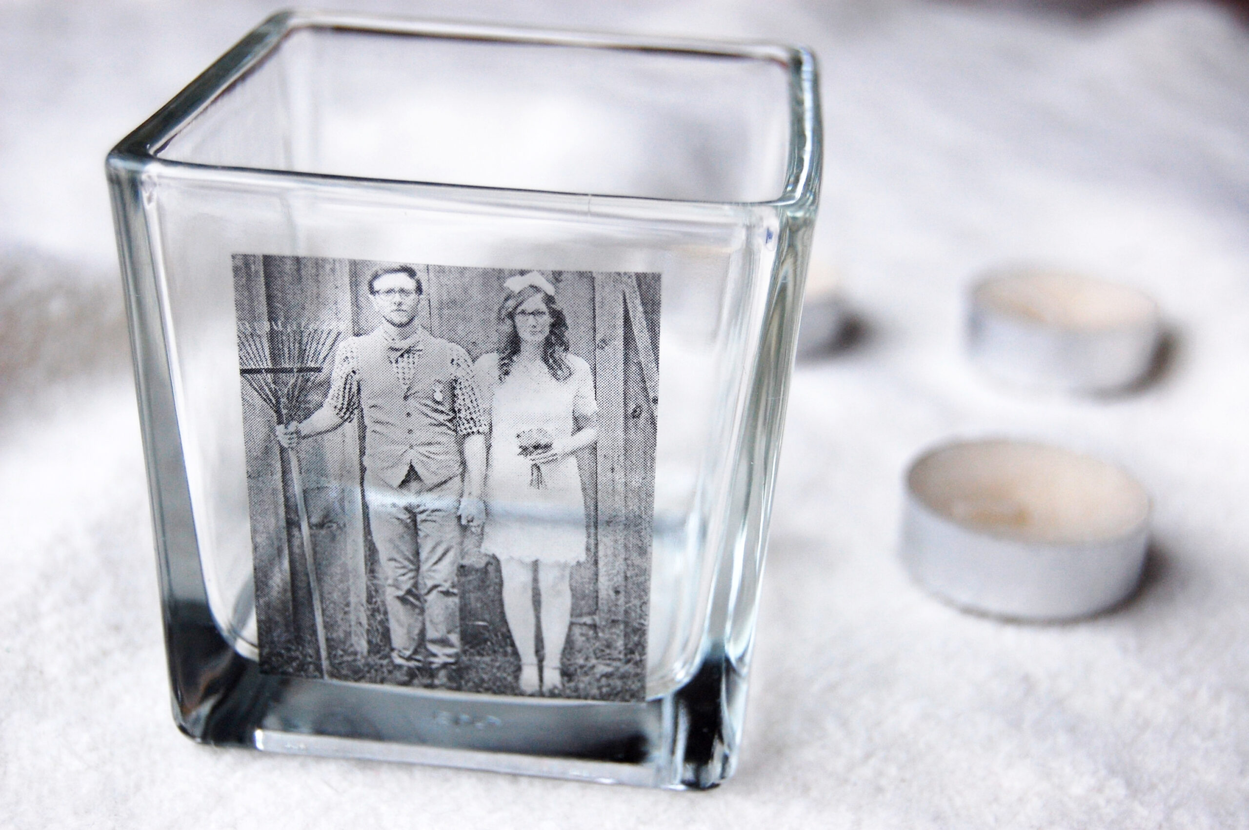 Finally, making some personalized glass votives would be a classy way to light up date night or brighten a friend’s home. Making these for yourself? Choose images that inspire you. This project works for any image (black and white or full color!) printed on a laser printer or cut from a magazine. Size your images appropriately and print them to get started. Then, thrift some glassware and watch the video below to find out how easy this customizable craft is. You could even place an image on the bottom of a clear glass plate to act as a jewelry holder or key catch!