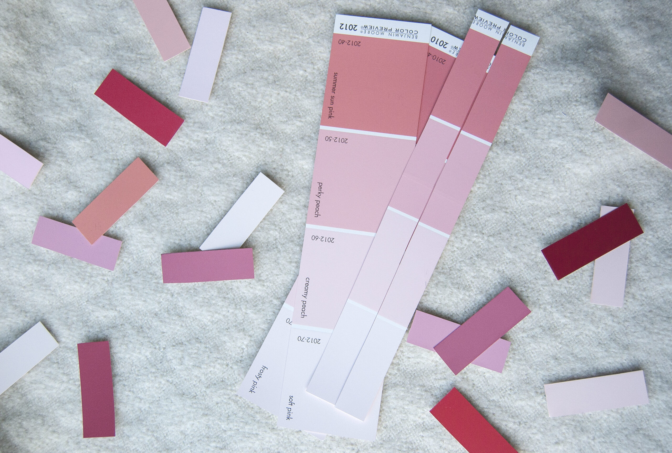 Once you’ve printed out and cut your 52 reasons, start trimming the color swatches to size. I didn’t use a ruler to measure, but roughly cut each swatch the long way into thirds. The first third is the side with text so trim that off and discard. The rest can be cut in half to create two mini-swatches of each color. Snip off all the white portions to get your individual pieces.
