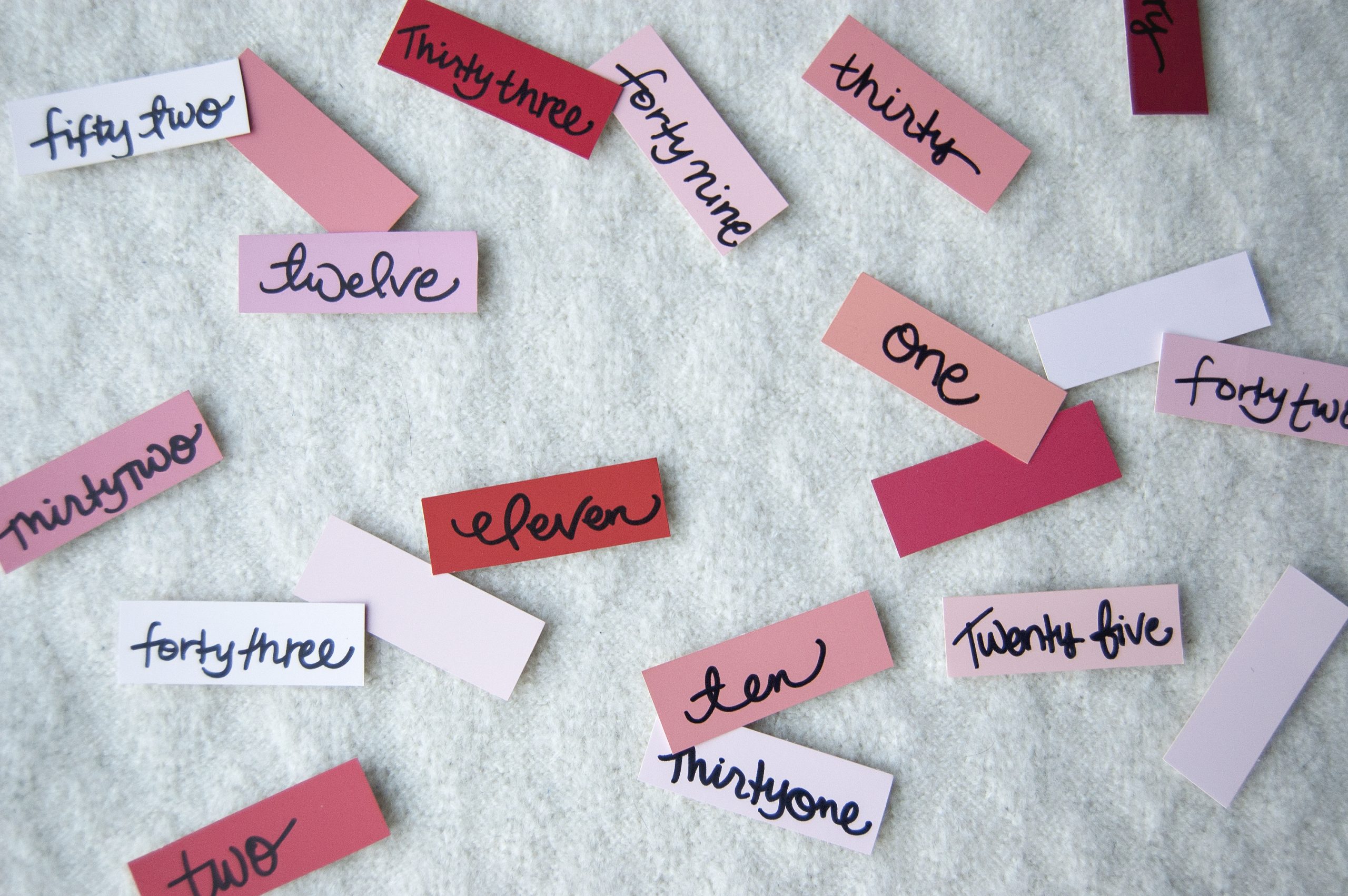 Write 1-52 numbers out on each swatch. I like the look of mixing up the colors, but you could also make a beautiful ombre effect by organizing them just so.