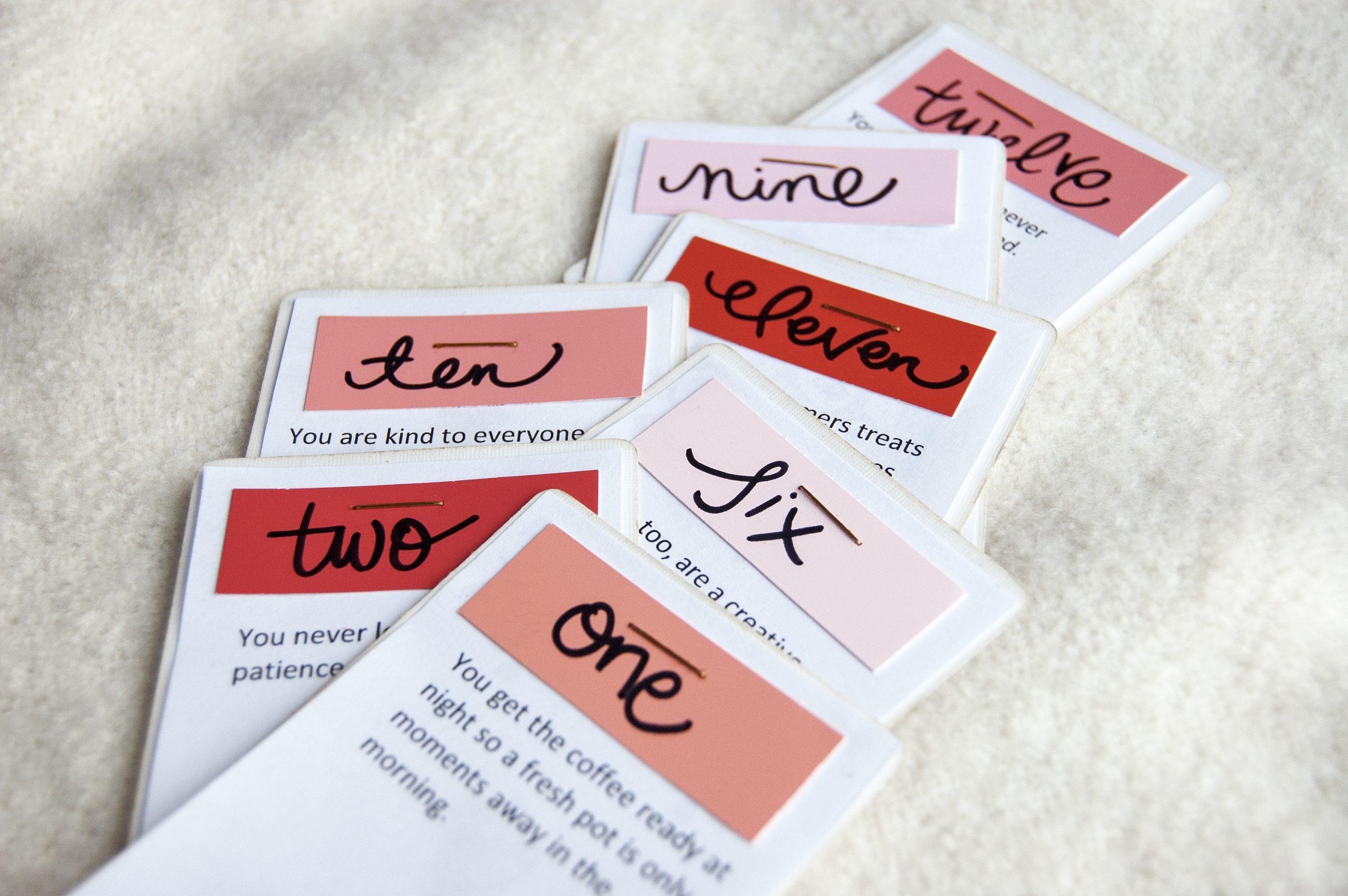 Layer a playing card on the bottom, a reason page in the middle, and a number swatch on top before stapling the pieces in place. Using gold, pink, or red staples is another fun and easy way to introduce color!