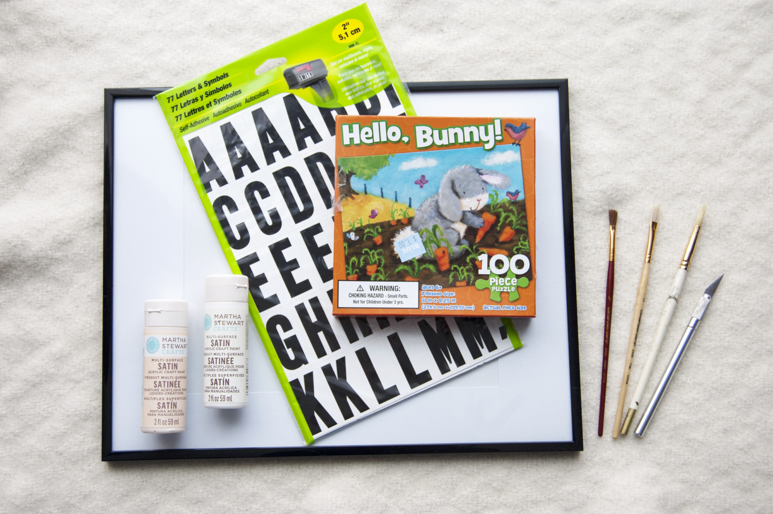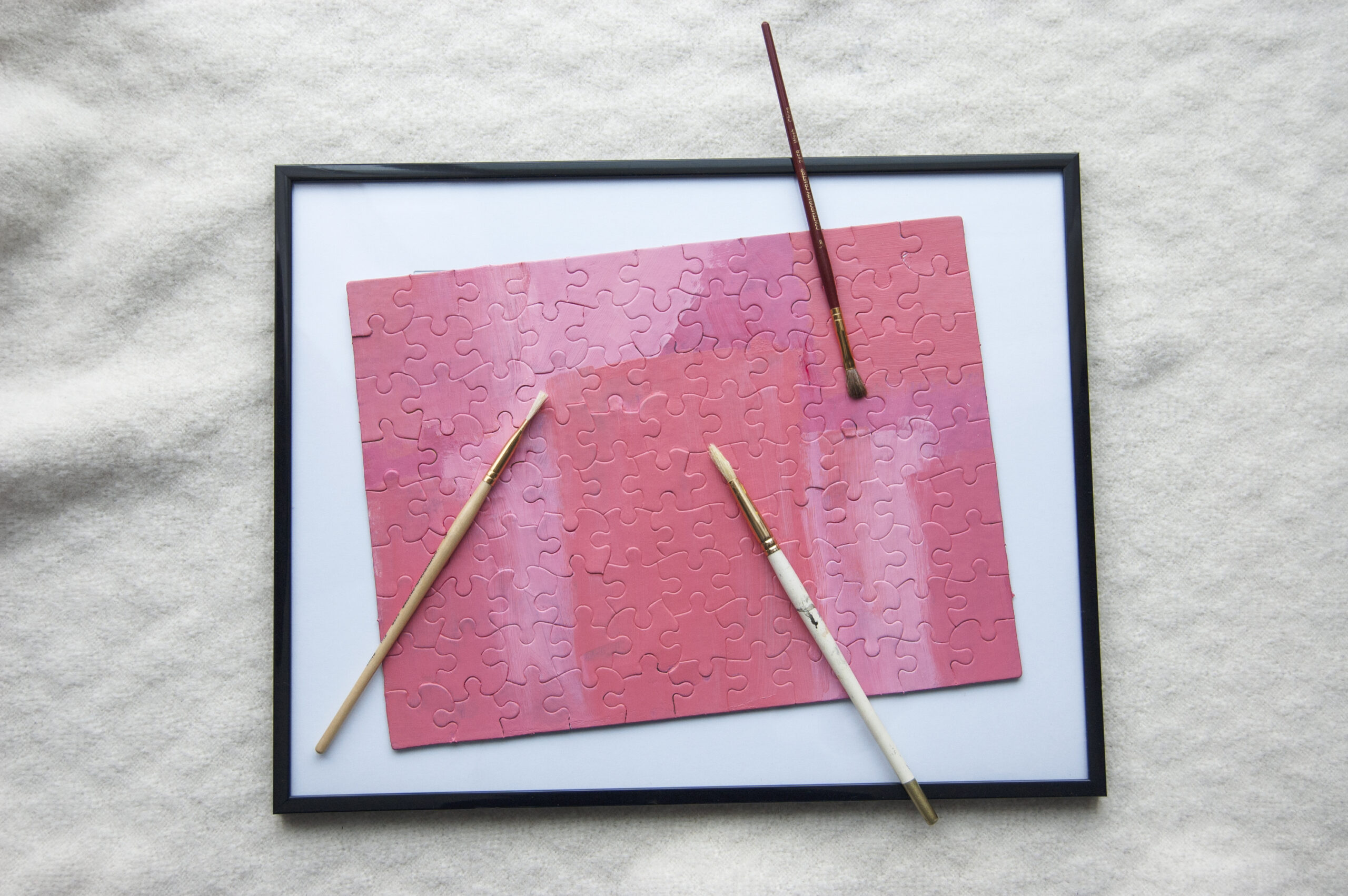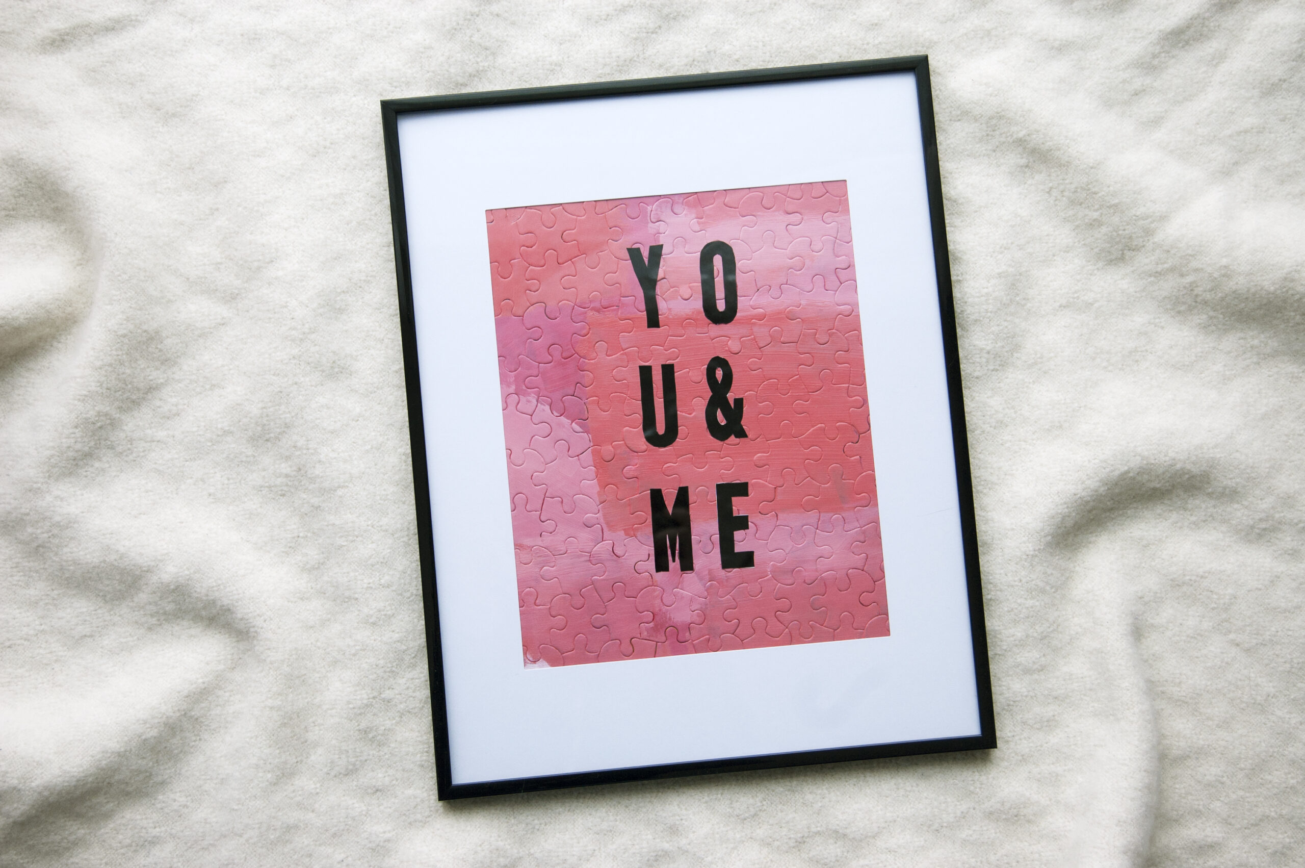 While your paint dries, use the Exacto knife to cut out the appropriate letters. Decide on the placement carefully before removing the adhesive back. When you’re sure you love your layout and you’re positive the paint is dry, stick the letters on and frame your new art! I think the subtle puzzle shapes peeking through blush tones topped by stark black letters create a satisfying contrast. If you’re looking for another way to re-purpose puzzle pieces, check out this DIY card tutorial.
