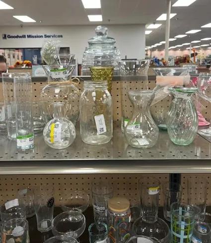 While Galentine’s Day is a fun holiday to celebrate in person, you can also celebrate it with friends near and far with a little bit of creativity! A lot of my friends, like me, love shopping at Goodwill® and finding unexpected treasures that inspire new projects. My most recent trip to Goodwill sparked an idea that I could do with friends, no matter where they lived. All they needed was a trip to Goodwill, a few different types of flowers and Internet access.