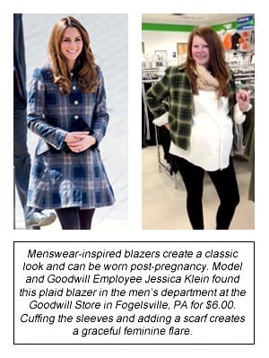 With so many maternity options at Goodwill – the actual maternity section, larger sizes, menswear, and selecting forgiving cuts in your own size (that can still be worn after pregnancy!) – you may need more focused fashion inspiration. Enter this Kate Middleton maternity fashion post by Goodwill Keystone Area (Harrisburg). It can help you select styles that are worthy of a princess by favoring classic patterns in sleek cuts. Just because pregnancy makes you feel crummy doesn’t mean you can’t at least look elegant.