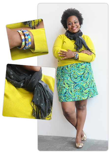 Not sure if you can pull off such a bright color? Try matching it with something else that incorporates that color subtly. Damara from Goodwill Industries of Southeastern Wisconsin and Metropolitan Chicago did so in the outfit pictured above (which only cost her $23 at Goodwill!). Having the same chartreuse shade in her skirt and on her bangles makes the luminous sweater look like it truly belongs. By the way, this trick works for home décor, too! If you love the look of a bright citron chair, find a rug or some throw pillows for the couch that match so you can tie it all in together!