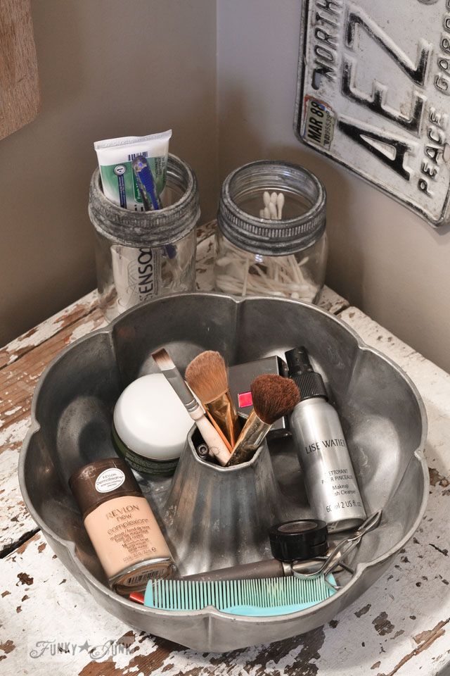 First up, the perfect cosmetics corral: a Bundt cake pan! I discovered this brilliant solution to messy bathroom counters thanks to Goodwill Industries of Monocacy Valley Inc. (Frederick, MD) and their DIY Home Pinboard! I love this idea especially because it allows brushes to stand up straight, while all other random daily necessities are easily accessible, but rounded up in one enclosed space. Plus, pans like this are always a great price at Goodwill so it’s easy and affordable organization.