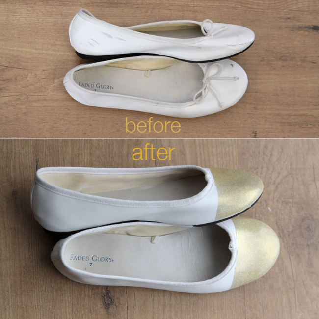 Next, how about those flats that have seen better days, but would work really nicely with a variety of ensembles? Fix them up in five minutes with a little spritz of spray paint. This fashionable DIY is compliments of the blog It’s Always Autumn. I love the sparkly gold, but would also be excited to see how neon toes might work out. Anyone ready to give this a try?