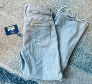 So, I picked a warm spring-like day to walk about a mile away to my closest Goodwill store and started searching through the racks for what would become one of the most important staples in my closet. It wasn’t long before I made the ultimate score — a pair of high-waisted Mother denim wide-leg jeans in my size. What are the chances? Not only were the jeans exactly what I was looking for, but they were a steal for $14.99. At retail price, they’re listed as $248 (plus tax, plus shipping.)
