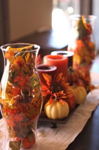 I don’t know if my family is unique in this, but when we set the table (centerpiece included) we all do it together. A few people carry in small stacks of plates, others grab napkins, and the little ones set the silverware. It isn’t one job of many that the host completes, but, as with every other aspect of Thanksgiving, it’s something we all share. With that in mind, when I saw these last-minute fall décor ideas from Horizon Goodwill Industries (Hagerstown, MD) I was particularly charmed by the hurricane candle holder idea filled with leaves! A quick project like this is something that an eight or 80 year old can collaborate on together to prep the table before the turkey’s carved. My local thrift shops are brimming with glass jars like this and colorful leaves litter the ground outside, so the preparation ahead of time is limited!