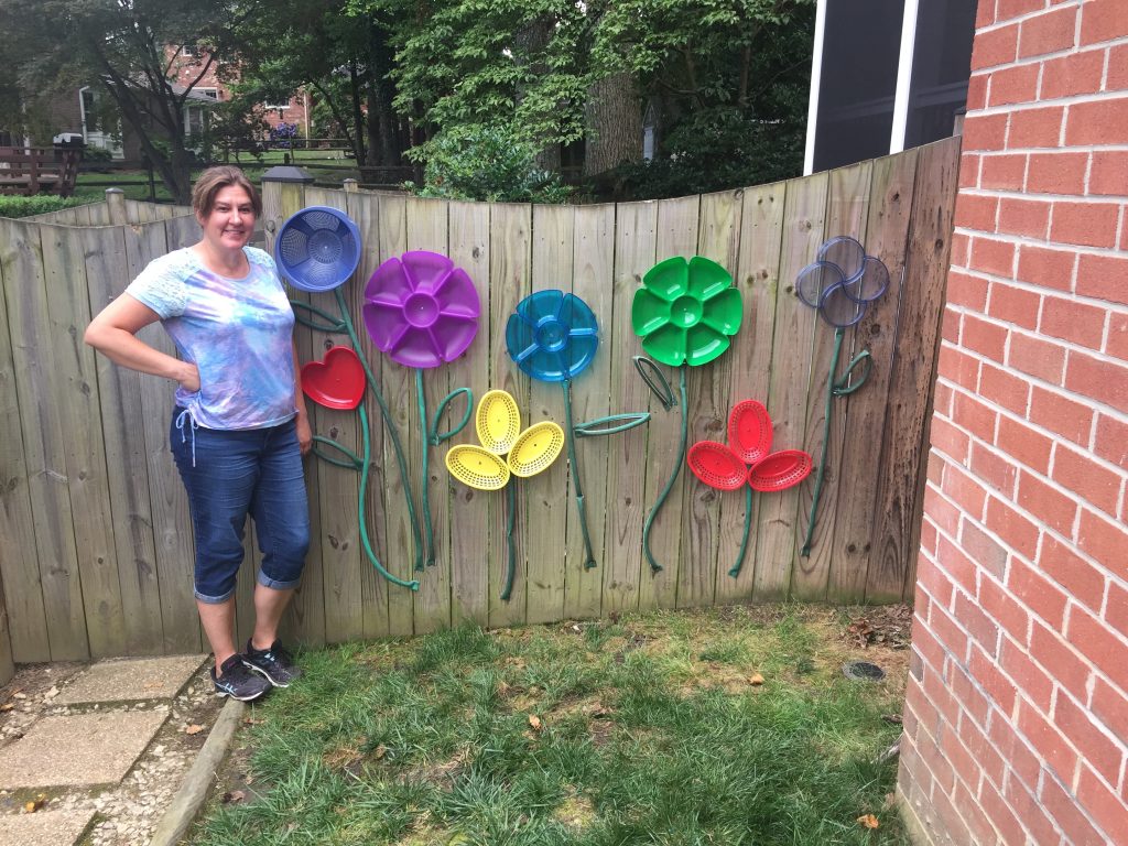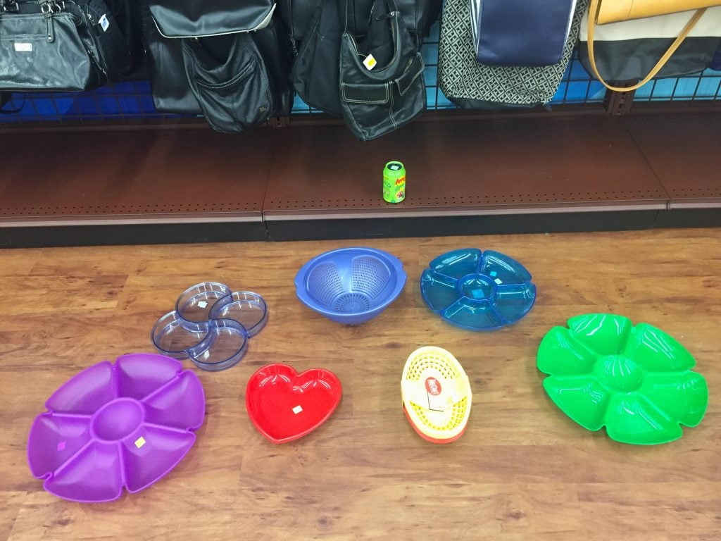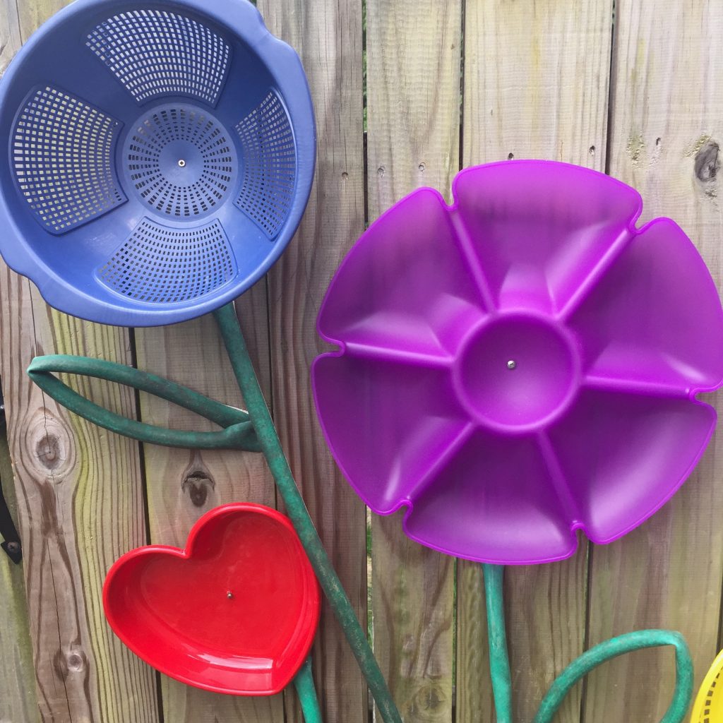 I found a few other items, including a set of plastic hot dog baskets that looked like petals, a big blue colander that looked like a bud, and a heart-shaped tray that just looked like fun. (Every garden needs a little love!) I spread them all out on the floor at Goodwill to see how they looked together. My upcycled flower garden idea had taken root.