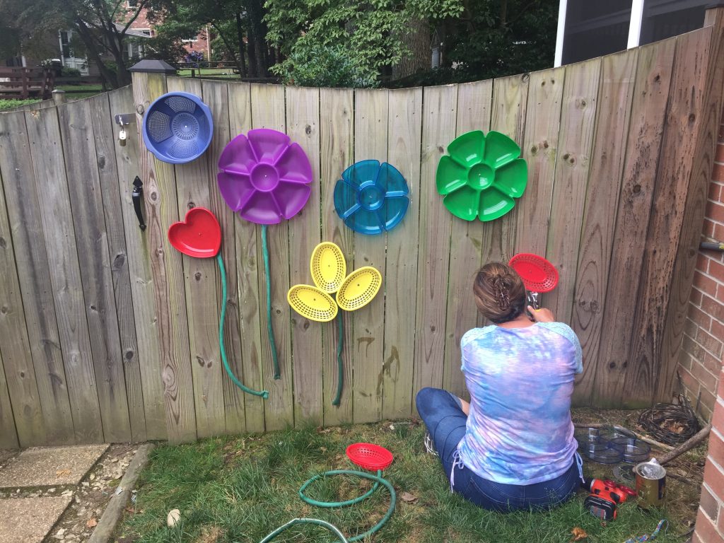 To plant my upcycled flower garden, I drilled a small pilot hole in the center of each tray, being careful not to crack the plastic. Then I screwed everything to my wooden fence. When choosing items for the flowers, look for softer plastic that won’t crack when you drill it.