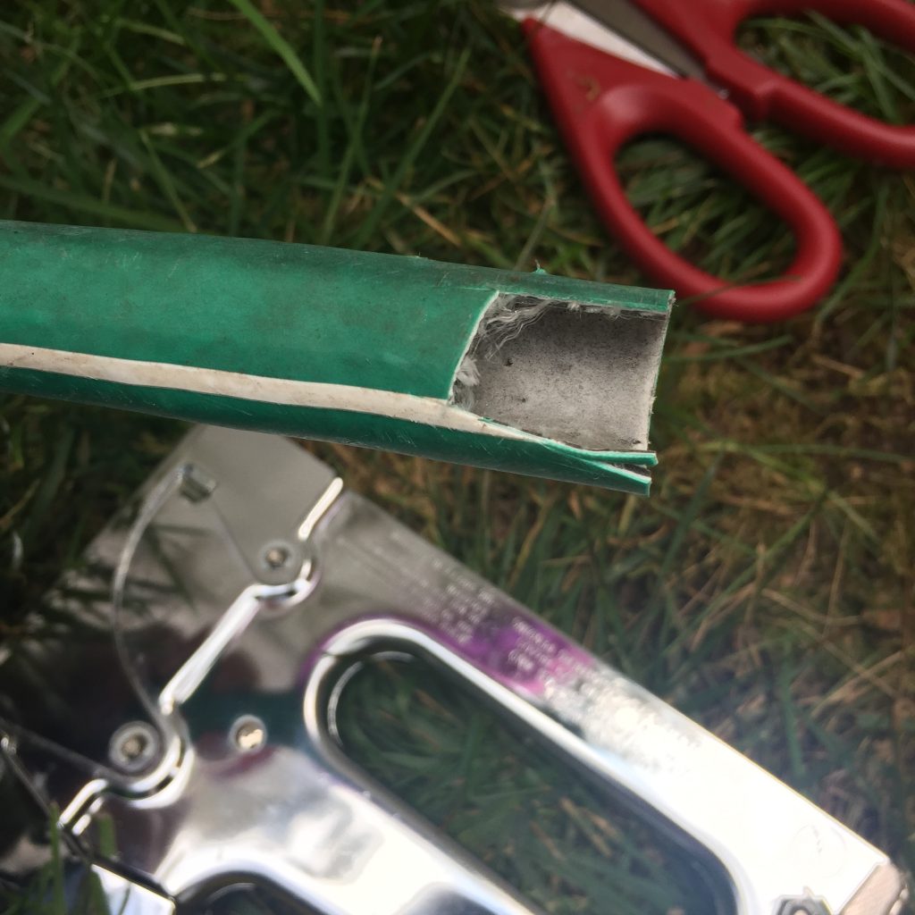One thing I discovered was that the rubber hose was too thick for my staples to shoot through. So I cut a little “notch” reduce the thickness on the ends so I could flatten that section of hose and staple it in place.