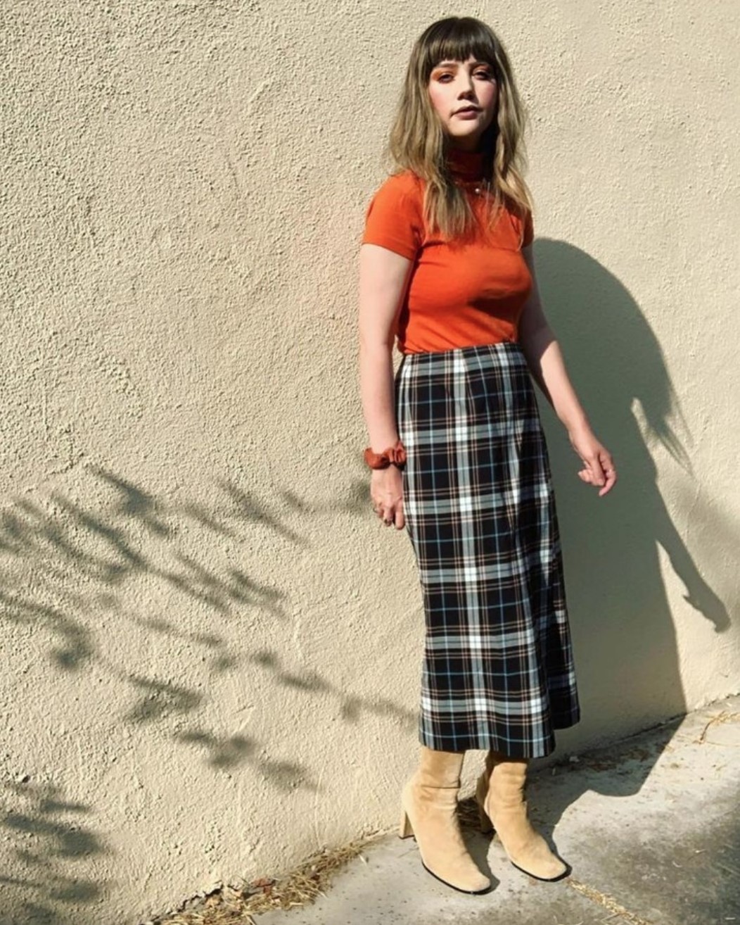 Here’s some fabulous finds to inspire your Goodwill trip into the orange unknown. This one, from the Goodwill of South Central California that is just what I’m talking about. SUPER autumnal all-Goodwill look topped off with a classic plaid and boots. The 70’s vibe of the long skirt really brings that pop of orange home. (Also, wrist scrunchie for the win!)