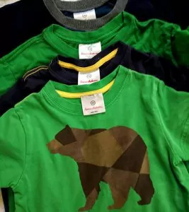 I scope out the children’s section the way I do bank interest rates. Thoroughly. Because if you pay attention, you just might find exactly the brand you like in a whole spectrum of sizes for them to grow into later. I was lucky enough to find this group of Hanna Andersson goodies, ranging from 2T to 7 at the same time– in one shop. And at $2 each, it was well worth the extra time spent going through the stuff in larger sections.
