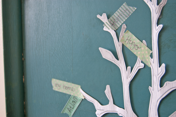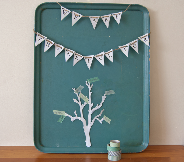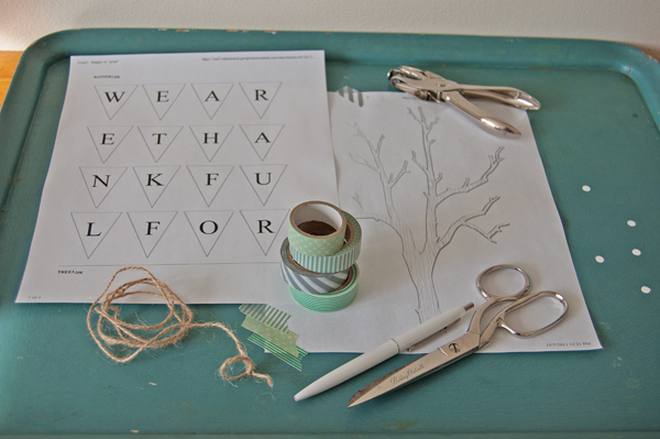 Visit your local Goodwill’s kitchen aisle searching for a breakfast tray. If you don’t have any string or twine at home, make sure you check the craft section of the store, too. You’ll also need scissors, a hole-punch, green washi tape, a pen, plus this banner template and this tree template (free downloads!).