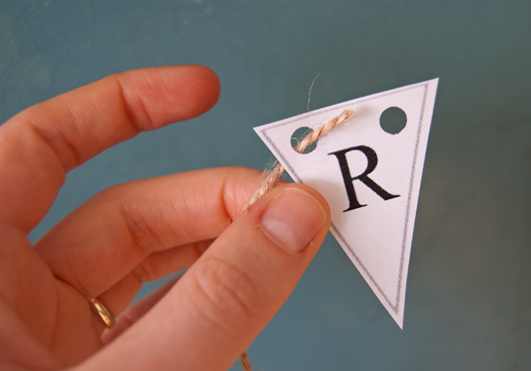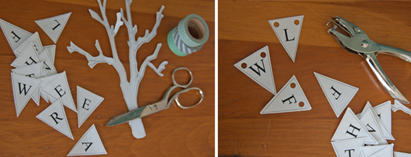 Start by printing out the two templates on regular 8 ½ x 11 paper and cutting them each out. Printing on cardstock will make your project sturdier, but I used regular paper and mine came out just fine. Once everything’s cut out, punch a hole in each of the top two corners of every banner triangle.