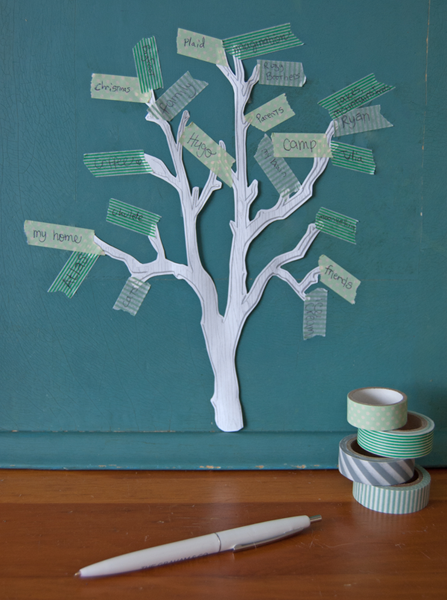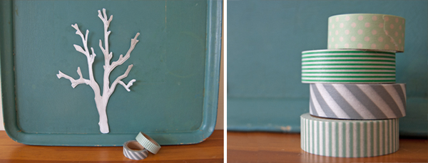 Place a few of pieces of rolled tape on the back of the tree and adhere it to the bottom of your tray. It’s okay that most of the branches are flying free because when you add the washi tape “leaves” they’ll overlap the branches and help them stay where they need to be.