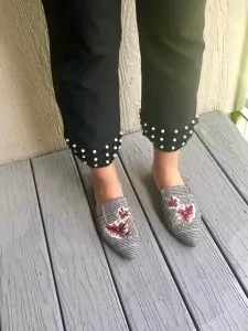 To add some extra flair to your favorite pair of pants, think of adding some embellished details. It could be a fun DIY project and you can sew or take a strong glue gun to the beads and pearls to add them on. You also might be surprised at the fun finds you’ll come across at your local Goodwill. There’s always a designer surprise in the racks and all you have to do is find it.
