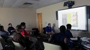 Students watch an instruction module during the specialized Autism class at Goodwill’s Work Adjustment Training Program.